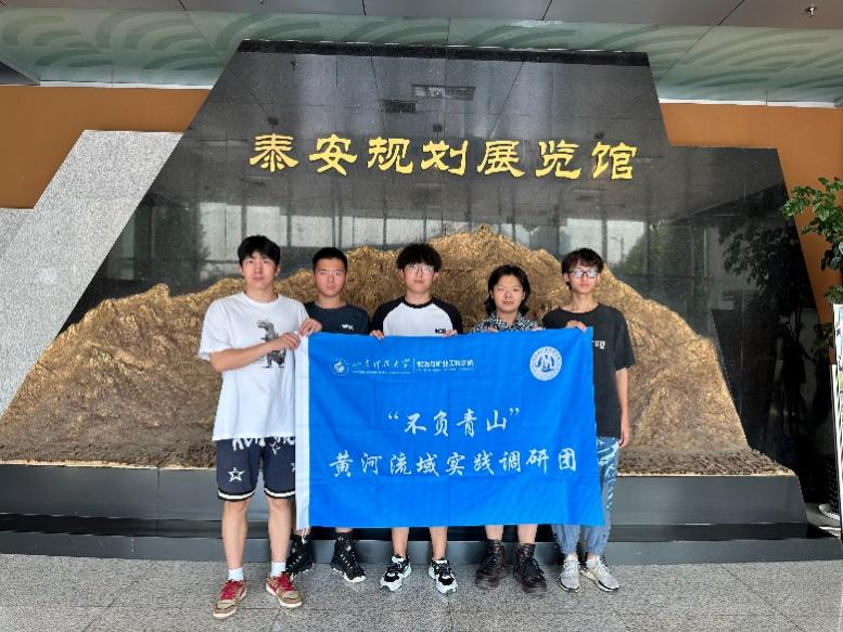 在泰安,团队成员们在山东科技大学泰安校区门口集合,参观了泰安规划展览馆,对泰安当地的相关政策进行学习与了解,学习了当地为推动黄河流域生态保护采取的措施和规划以及了解了泰安作为老旧矿山城市未来的规划发展。