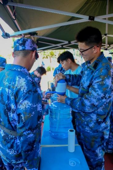 军训现场,辅导员和学生会的志愿者们为参训同学保驾护航,为教官和同学们提供了水、纸巾、药品等军训用品,做好后勤保障工作。
