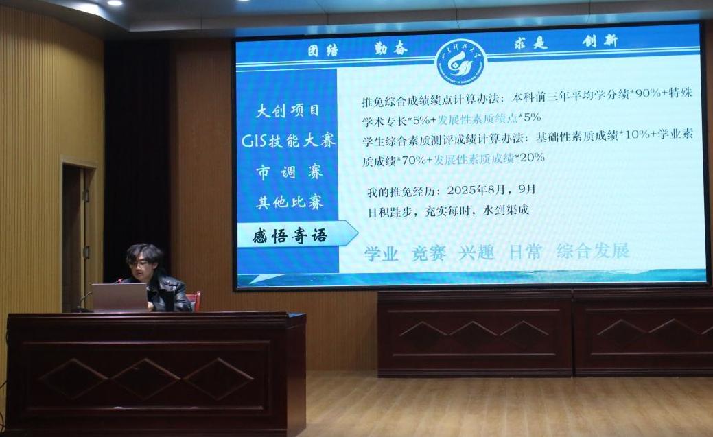 讲座中,张容恺以自身三年成长轨迹展开分享。从大一初涉科创项目到参加全国高校GIS技能大赛、全国大学生市场调查与分析大赛等赛事并斩获佳绩。他结合参赛经验,将科创实践中锤炼的问题解决能力、团队协作技巧进行了细致指导。此外,他还分享了面对竞赛失利时的心态调整经验,传递“脚踏实地、勇于探索”的成长理念。