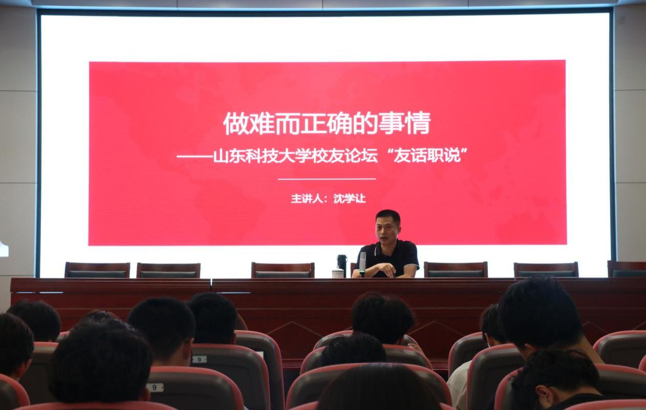 为了帮助同学们更好地了解就业市场、提升就业竞争力,6月19日,由大学生就业指导中心、校友办公室主办,yl88858永利官网承办的“友话职说”校友论坛在J6-433报告厅成功举办,北京天元律师事务所高级合伙人、山东科技大学杭州校友会执行会长、yl88858永利官网地质工程1994级校友沈学让受邀作题为“坚持做难而正确的事”的报告,论坛由yl88858永利官网团委书记王文鑫主持。