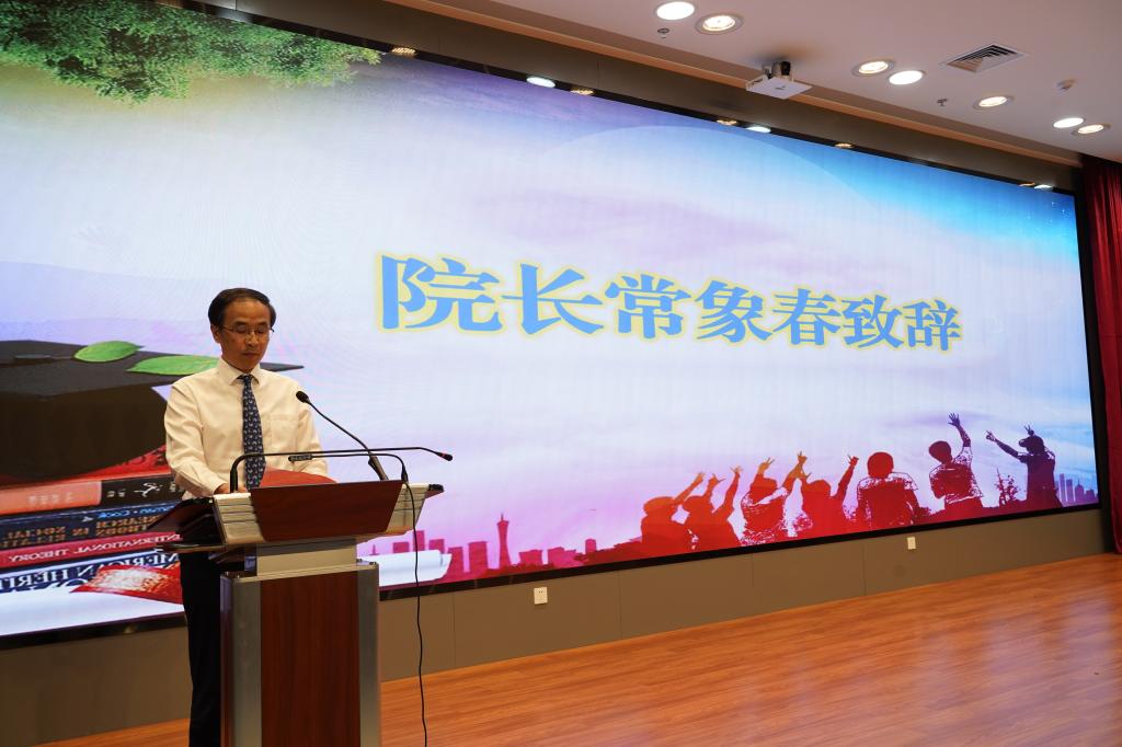 活动伊始,院长常象春用四个词向全体毕业生做临别赠言。一是脚踏实地(地):树立远大的理想,并脚踏实地付诸行动;二是科技引领(科):努力提高自己的能力,为国家的科技发展贡献力量;三是学无止境(学):要树立终生学习的理念,并做到“博学之,审问之,慎思之,明辨之,笃行之”;四是愿景宏大(愿—院):要有深厚的家国情怀,将自己的小我融入国家的大我,让青春在为祖国、为民族、为人民、为人类的不懈奋斗中绽放绚丽之花。