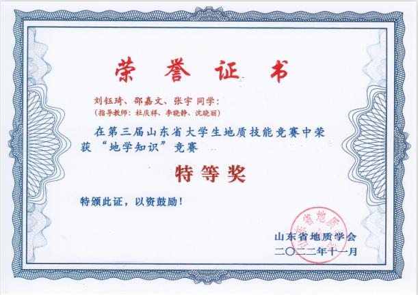 支部坚持党建与学生素质协同发展,组织举办实习成果展、摄影展等活动引导学生善于发现地质之美,激发学生学习兴趣;组织科技讲座、引导学生参加科技竞赛,提高学生素质能力。近两年,支部党员参加各类竞赛,取得丰硕成果。1人获全国大学生英语翻译大赛国赛三等奖,4人获第十四届“蓝桥杯”全国软件和信息技术专业人才大赛省赛二、三等奖,1人获2022年全国高校商业精英挑战赛 “精创教育杯”创新创业竞赛省赛二等奖,1人获中国大学生GIS软件开发竞赛国赛三等奖。除此之外,支部党员专业知识学习扎实,有较高的实际应用能力,9人参加全国大学生“创新杯”地球物理知识竞赛获团体二等奖1项,三等奖2项,3人参加全国大学生地质技能竞赛获地质标本鉴定项目一等奖,5人参加山东省大学生地质技能竞赛,获特等奖2项,一等奖1项,二等奖2项,三等奖2项。充分发挥了党员先锋模范作用,支部学风建设水平进一步提升,领头羊效应显著。