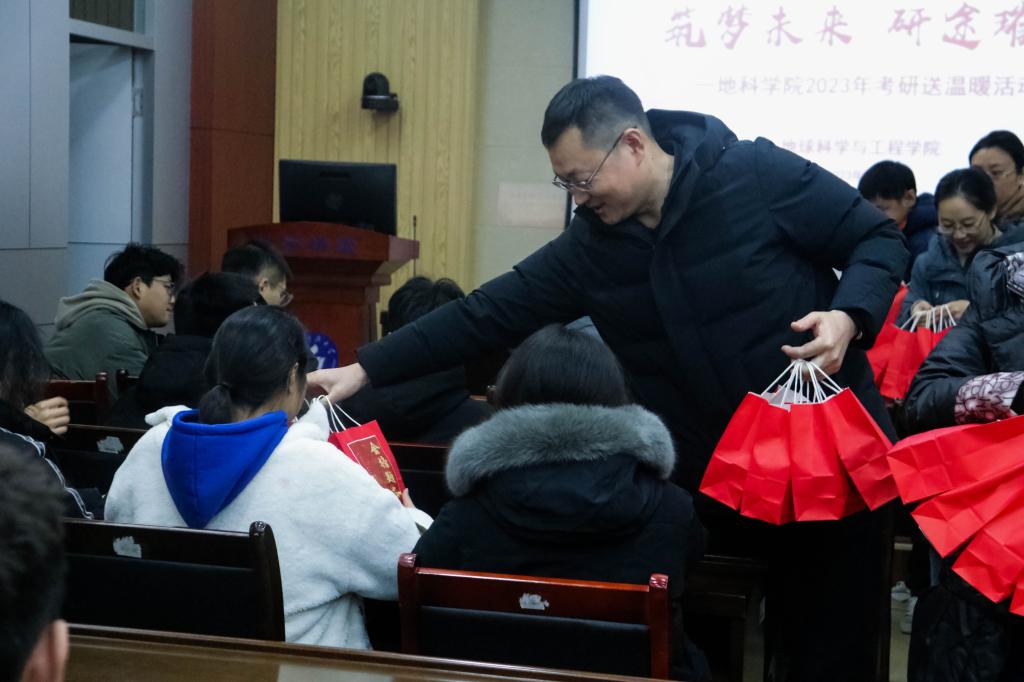 为舒缓考研学子的备考压力,帮助他们坚定信心,12月13日,yl88858永利官网在J6-530会议室开展“筑梦未来研途璀璨”考研送温暖活动,为考研学子送上暖心礼包、温暖祝福,助力考研学子研冬折桂。学院党委书记高慧、副书记兼副院长李晓静、地质学系党支部书记孔凡梅、矿产地质系党支部书记许庆林、地球物理系主任丁仁伟、水文与地质工程系党支部书记夏璐、辅导员俞功一山和考研学生代表参加了活动。