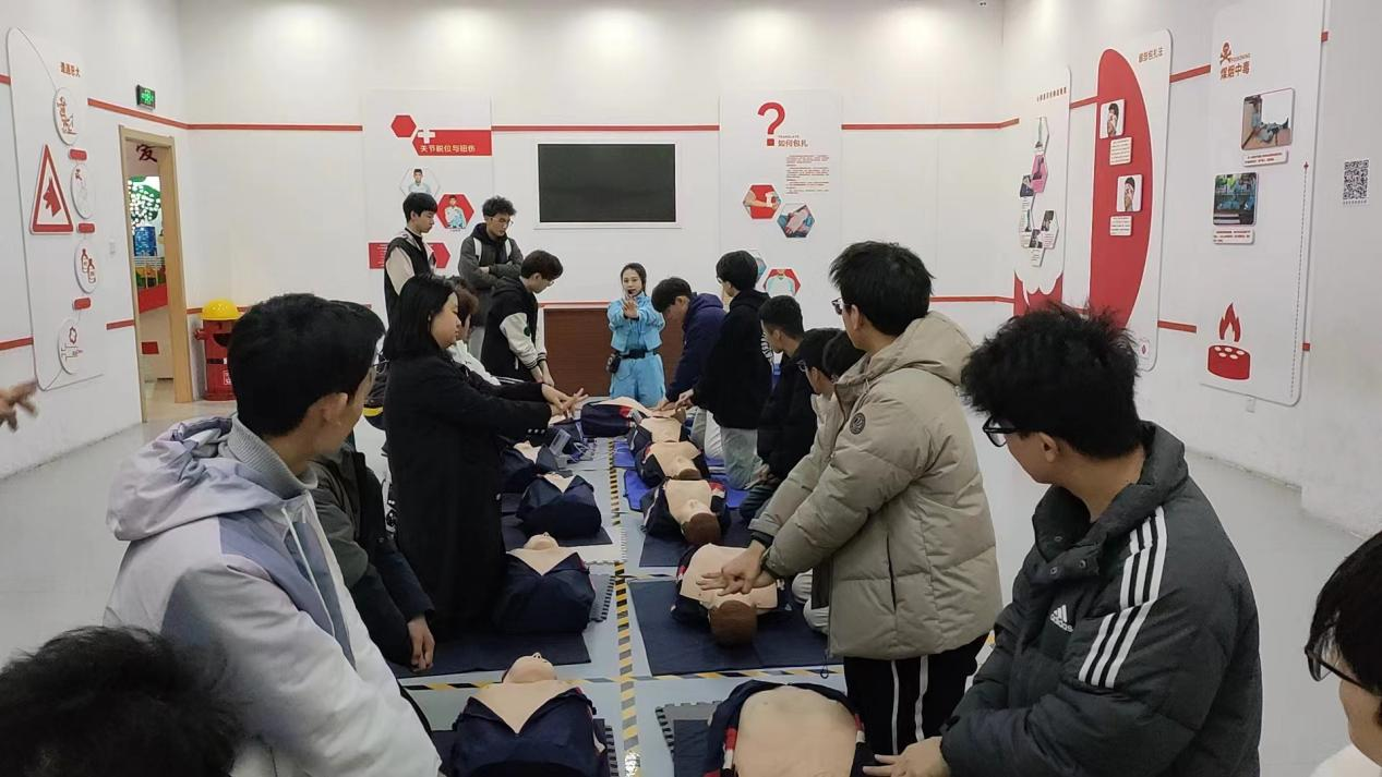 在基地专业人员的带领下,同学们分组对建筑安全、交通安全、消防安全、禁毒知识、地震逃生等模块进行参观,通过现场听讲解、亲身体验、VR模拟等多种方式沉浸式体验,尤其在人员急救环节,同学们重点学习了海姆立克急救法、AED除颤仪使用、心肺复苏等。
