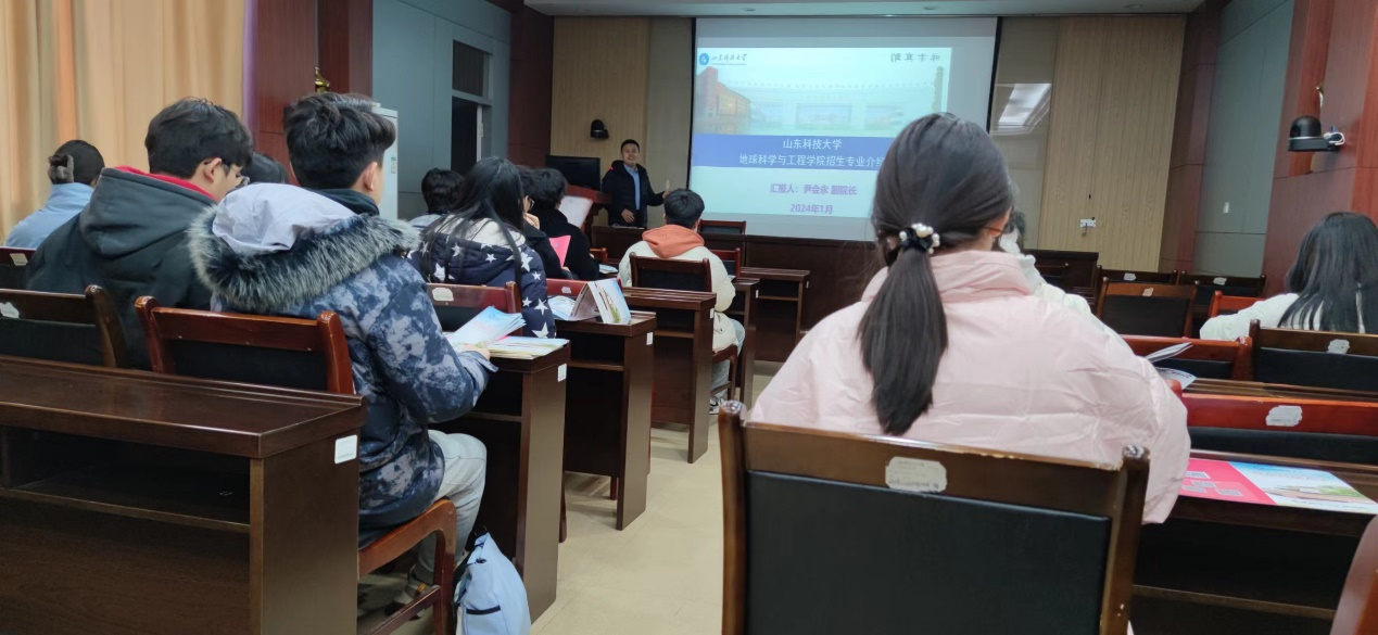 前期,为进一步做好本科招生宣传工作,不断增强宣传力量,号召更多成绩优秀、热爱地球科学的同学报考山东科技大学地球科学与工程学院,同时为丰富大学生假期生活,提高学生社会实践能力,让学生以实际的大学学习生活经历向学弟学妹们展示地球科学的奥秘,学院于2024年1月5日启动了以“了解山科大,热爱地球科学”为主题的“2024年寒假返高中母校招生宣传”活动。同学们积极响应,有30余名同学参与了该活动,他们奔赴自己的高中母校——阳谷一中、梁山一中、章丘五中、白银八中......,通过课件、视频、现场宣讲等多种形式进行了近20场宣讲。为便于同学们做好宣讲工作,临行前学院组织了相关培训,尹会永在培训会上对宣讲材料进行了详细讲解。