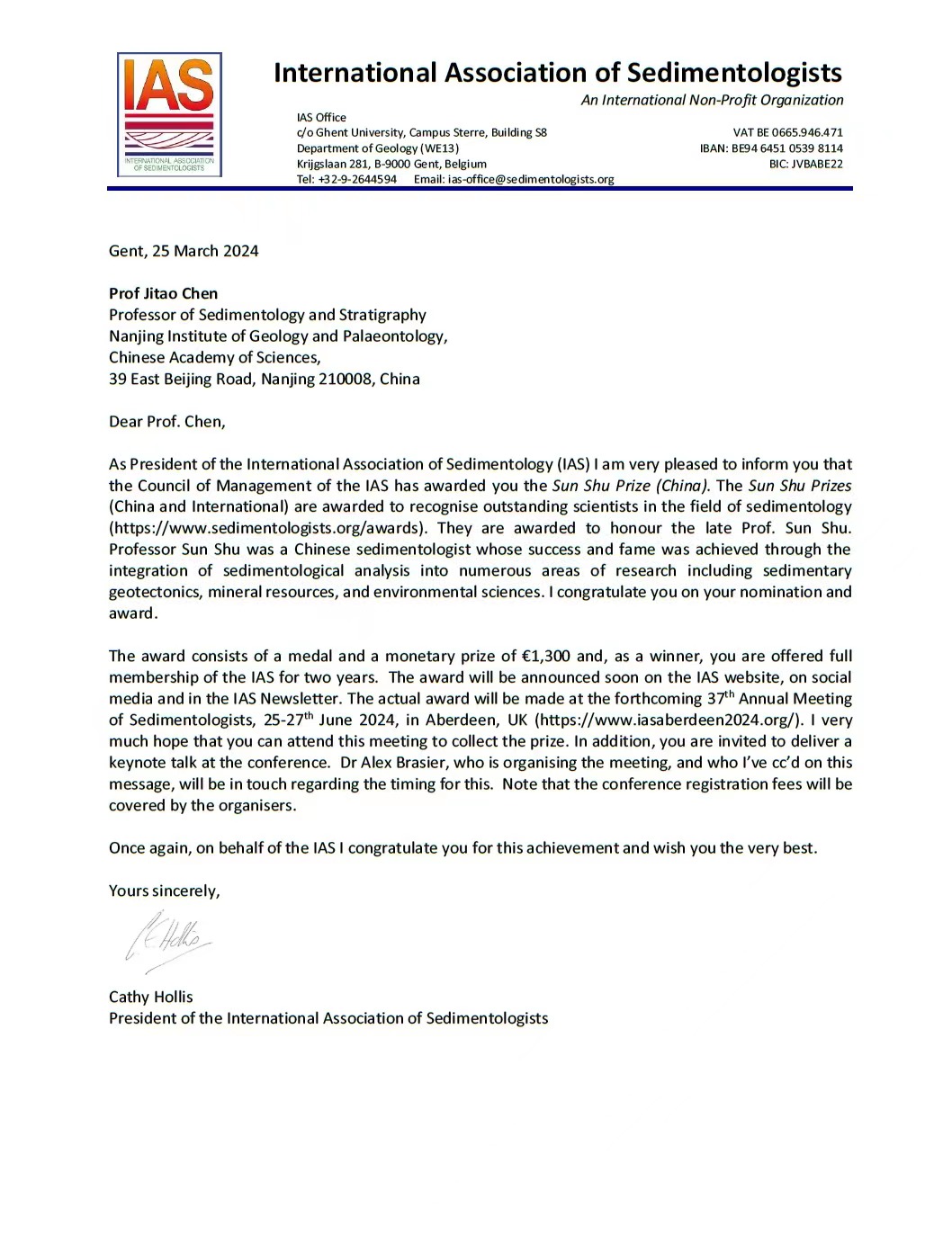 近日,国际沉积学家协会(IAS)公布了2024年度国际“孙枢奖”(Sun Shu Prize)获奖人名单,我院地质工程专业2000级校友陈吉涛荣获此奖。