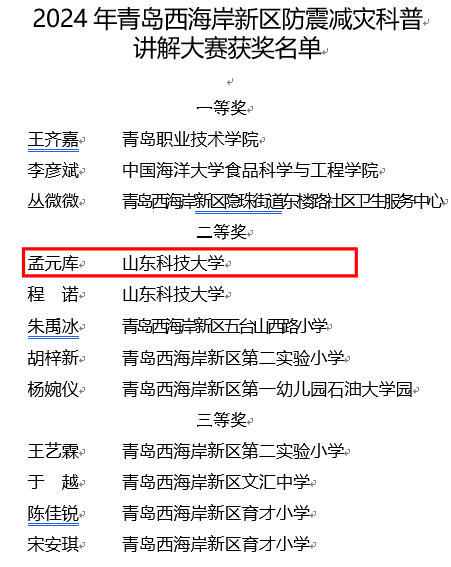 近日,由西海岸新区应急管理局、区教育和体育局、团区委、区科学技术协会联合举办的青岛西海岸新区防震减灾科普讲解大赛落下帷幕,我院副院长孟元库教授荣获大赛二等奖。