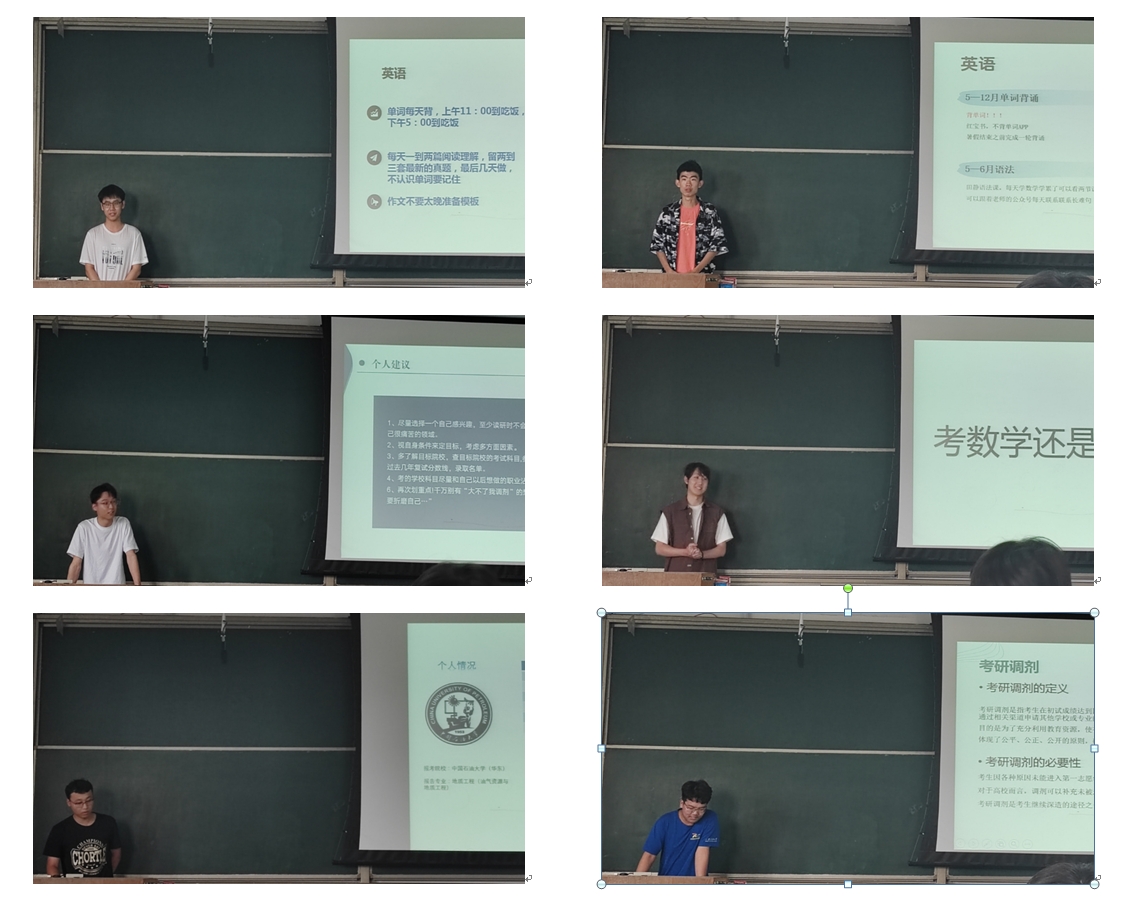 之后,资源勘查工程2020级优秀学生代表杨昌昊、王光磊、张彤、高秀浩、刘展、刘楷睿等分别分享了他们的考研经历、经验与心得,并悉心解答了同学问的各种考研问题,并给出了参考建议。