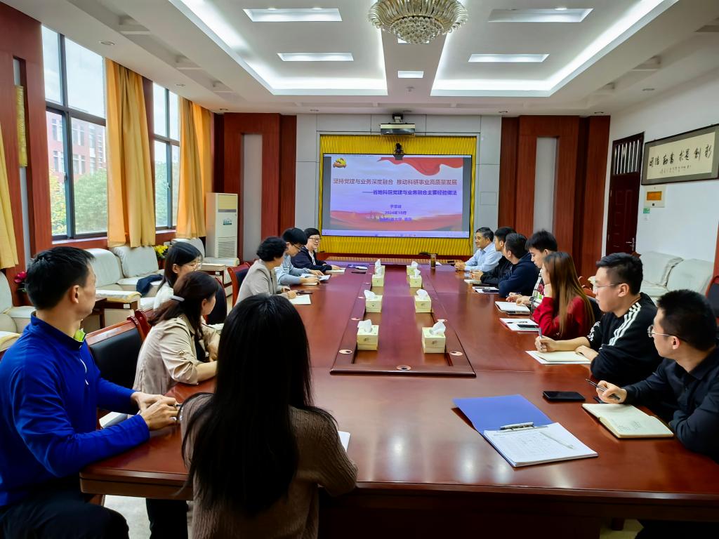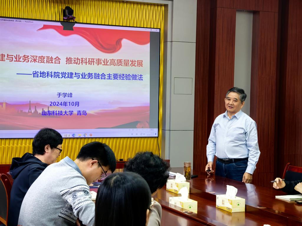 于学峰以《坚持党建与业务深度融合 推动科研事业高质量发展——省地科院党建与业务融合主要经验做法》为题,结合省地科院在党建引领下所取得的一系列突出成绩,介绍了山东省地质科学研究院“四保障一基础”党建与业务融合的经验做法。“四保障一基础”做法一是压实机关党建责任,为党建与业务融合提供政治保障;二是实施“双带头人”制,为党建与业务融合提供组织保障;三是强化党建制度建设,为党建与业务融合提供制度保障;四是创建特色党建品牌,为党建与业务融合提供思想保障;五是组织“党建+”专业特色活动,为党建与业务融合奠定实践基础。省地科院党委坚持党建引领,创新推动党建与业务融合发展,在破解“两张皮”方面进行了一些有益探索和实践,取得了一定成效,2019年被省直机关工委确定为“省直机关基层党建示范观摩点”,“党建引领 金石为开”党建文化品牌被评为“全省机关党建优秀创新案例一等奖”,先后荣获“全国先进基层党组织”“全国文明单位”“全国国土资源管理系统先进集体”“全国模范地勘单位”“全国地质勘查行业先进集体”等多项荣誉称号。报告结束后,于学峰同与会人员就“党建+”及支部品牌建设等工作进行了进一步深入交流,为大家进一步厘清了党建品牌建设工作思路。