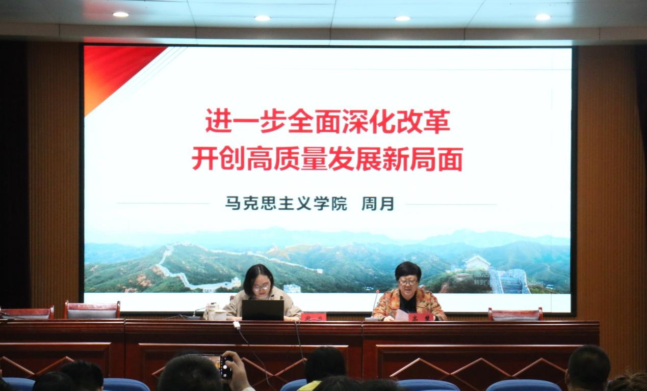 10月29日,yl88858永利官网邀请学校“山海泉”理论宣讲团成员、马克思主义学院副教授周月作党的二十届三中全会精神宣讲报告,报告由学院党委书记高慧主持,学院全体党员教师参加。