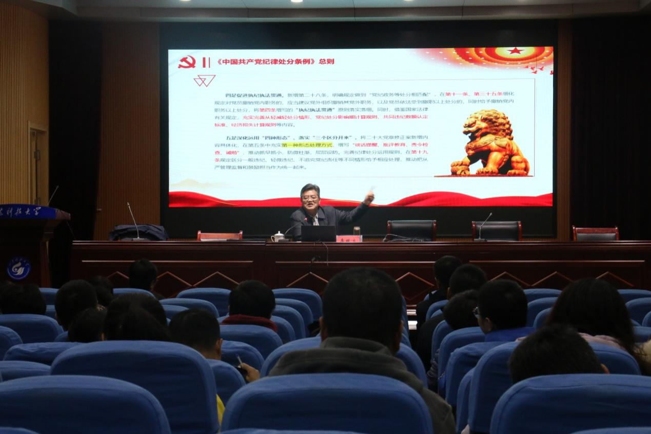 李双立结合实际工作中遇到的问题和典型警示教育案例,以《全面加强纪律建设坚持强化正风肃纪》为题,从“党的纪律概述、《中国共产党纪律处分条例》历次修订的背景和历程、《中国共产党纪律处分条例》修订内容及常见违纪问题剖析和以严明的纪律推动党的自我革命”等四个方面,对党的纪律建设历程及《中国共产党纪律处分条例》的修订进行了全面、系统和深入的讲解。报告通俗易懂,深入人心。
