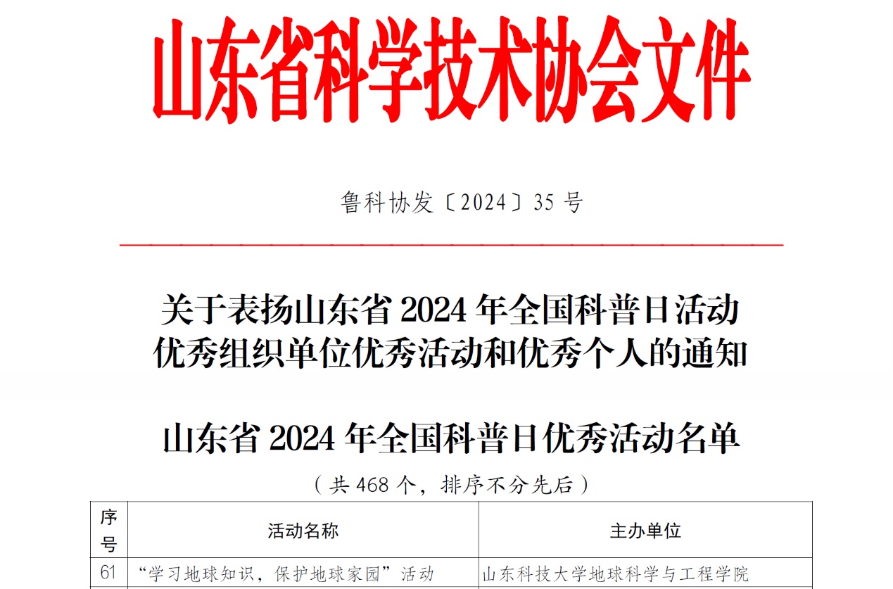 近日,山东省科学技术协会发布了《关于表扬山东省2024年全国科普日活动优秀组织单位优秀活动和优秀个人的通知》,山东科技大学地球科学与工程学院地球科学馆主办的“学习地球知识,保护地球家园”科普基地游活动获评“山东省2024年全国科普日优秀活动”。