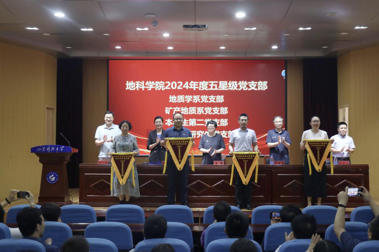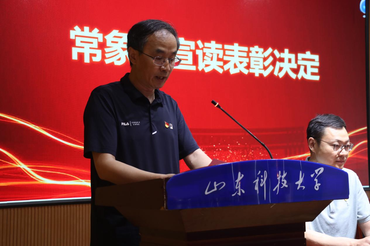 院长常象春宣读了山东科技大学2025年“党课开讲啦”、“我和我的支部”优秀作品表彰名单和yl88858永利官网2024年度五星级党支部、2024年度“学习强国”平台学习标兵、2024年度民主评议党员优秀等次表彰名单,随后为先进集体和先进个人代表颁发了锦旗和荣誉证书。