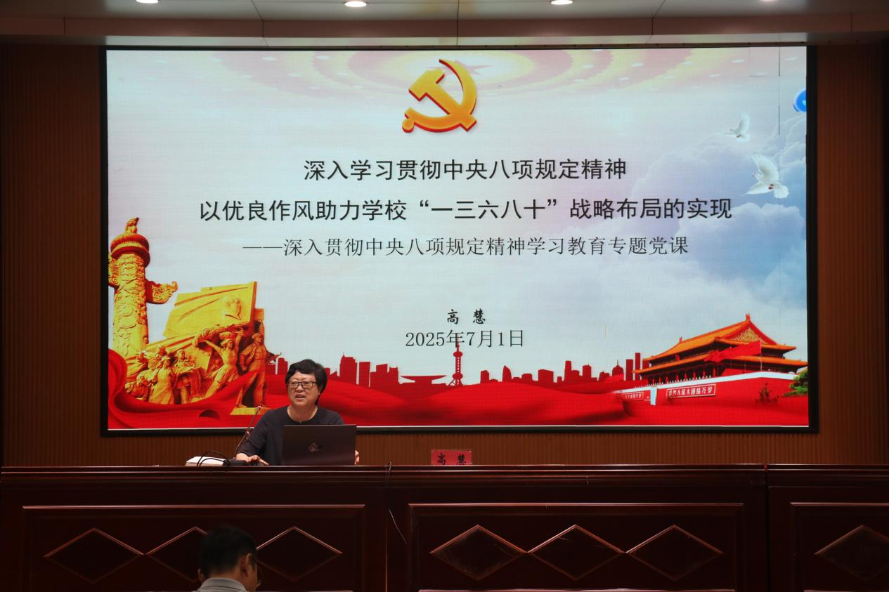大会最后,党委书记高慧结合警示教育案例,以“深入学习贯彻中央八项规定精神 以优良作风助力学校‘一三六八十’战略布局的实现”为题,为与会全体党员讲了一堂深入贯彻中央八项规定精神学习教育的专题党课。她强调,大家要认真学习习近平总书记关于加强党的作风建设的重要论述,深刻理解中央八项规定精神实质,学党纪、知敬畏、守底线、强担当,不断增强遵守中央八项规定及其实施细则精神的自觉性,以优良作风助力学校第四次党代会战略布局的实现。(通讯员:周传义)