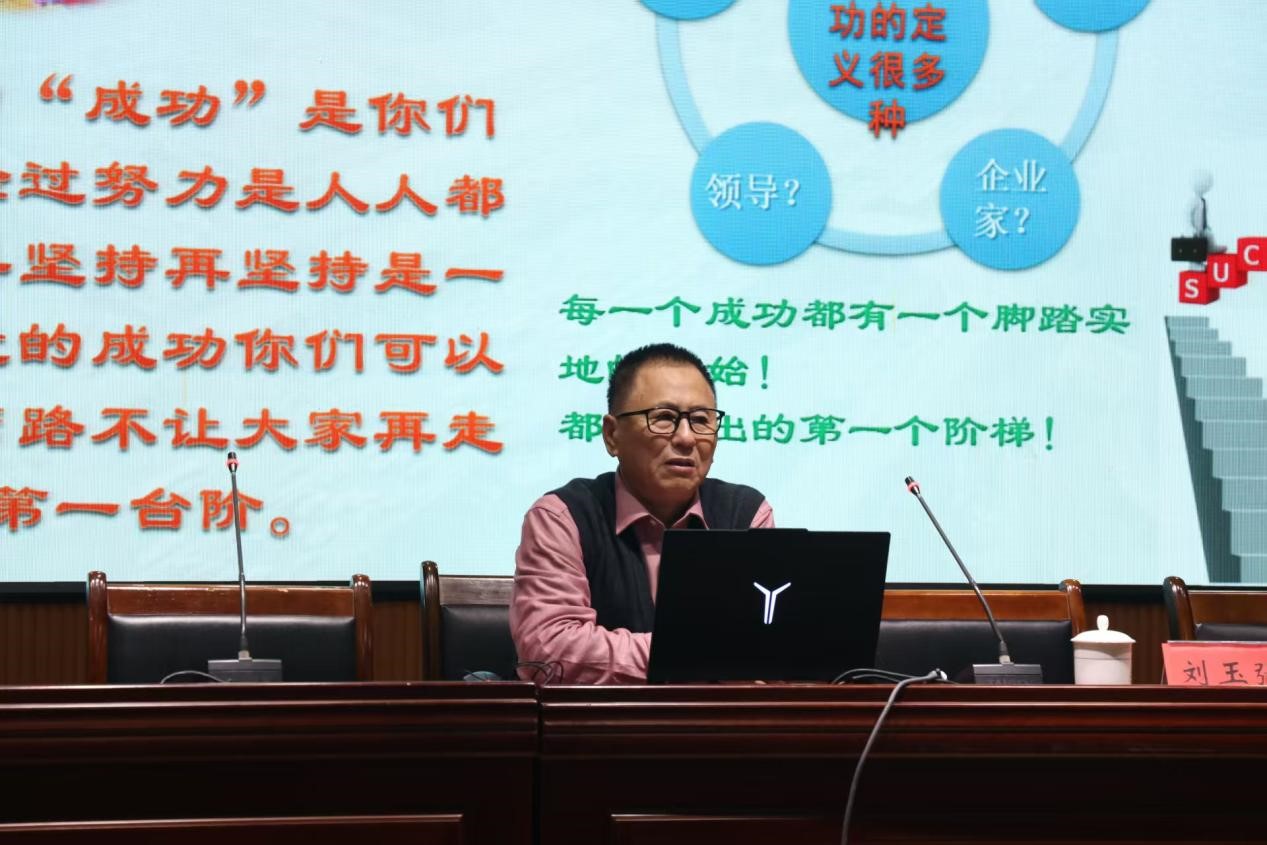 刘玉强以《刻苦学习,坚持努力,实现理想——一位老大学生的寄语》为题,结合自身丰富的学术与实践经验,从新时代对大学的时代要求、认真学习、成熟思想、工作态度、关系处理等五个方面,勉励同学们珍惜大学时光,脚踏实地学习,树立远大理想;心怀善良与感恩,以实际行动报效党和国家,实现人生价值。