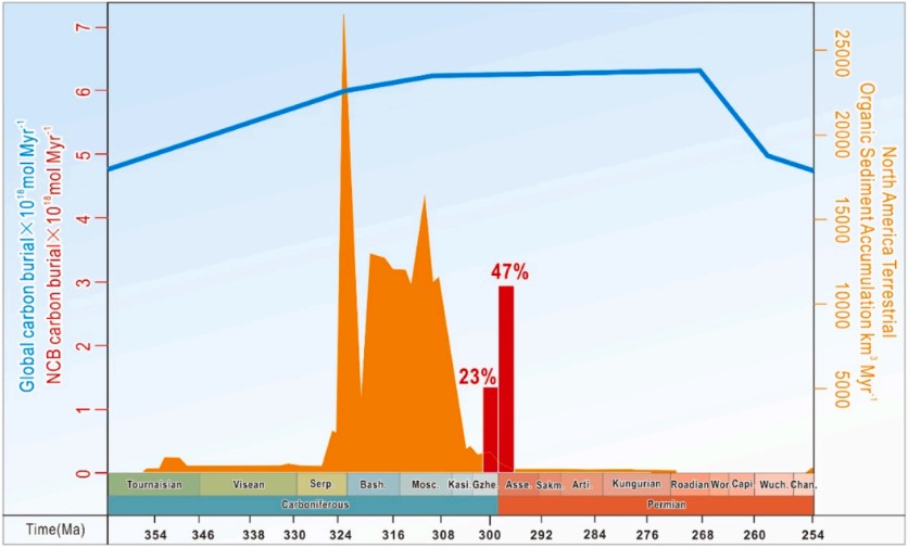 晚格舍尔期(23%)和早阿瑟尔期(47%)华北板块有机碳埋藏规模占同期全球比例