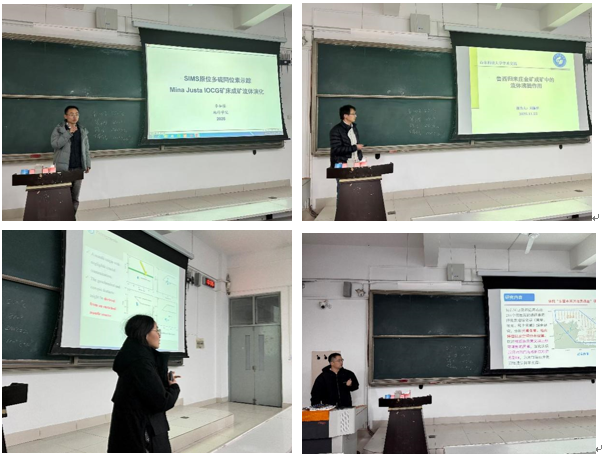 本次系列学术报告会围绕“变质作用与造山带演化”“岩浆作用与地幔过程”“成矿作用与成矿流体”“沉积环境与沉积盆地演化”四大专题展开。报告过程中,老师们结合科研实例,用通俗易懂的语言分享了各自的前沿学术研究成果。倪金龙以《鹊山变质核杂岩结构与演化》为题,深入解析了鹊山变质核杂岩的形成机制与金成矿的耦合关系;孔凡梅则聚焦胶–辽–吉带泥质孔兹岩中晶质石墨,讲述了晶质石墨成因机制,为相关领域研究提供了新视角;魏友卿与孟凡雪关于基性火山岩捕获锆石的地质意义和Kerguelen地幔柱EMII端元识别的研究,揭示了地球深部过程的关键信息;李如操通过多硫同位素示踪技术,详解了铁氧化物-铜-金矿床成矿物质来源与成矿过程;周振柱则深入分析了流体沸腾作用在成矿中的关键作用,为鲁西归来庄金矿成矿机制研究和未来勘探提供了理论支撑;随后,刘金庆、刘晓光、张丽萍、张凯棣四位老师,分别聚焦现代黄河水下三角洲演化、华北克拉通中新元古界地质特征、大沽河沉积物多环芳烃分布规律、东海内陆架泥质沉积区物源演变过程等研究方向,系统阐释了沉积地质学在环境演变解析、资源勘探实践等领域的应用价值。