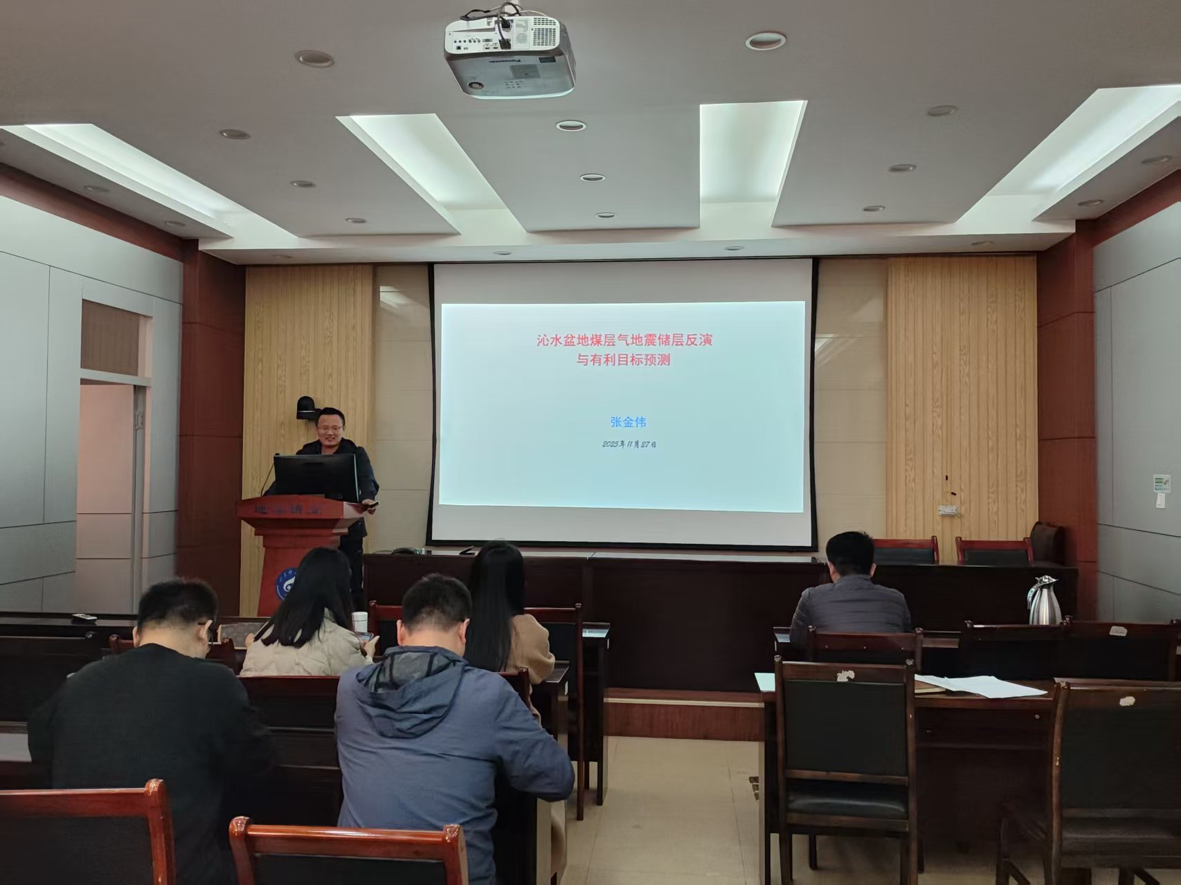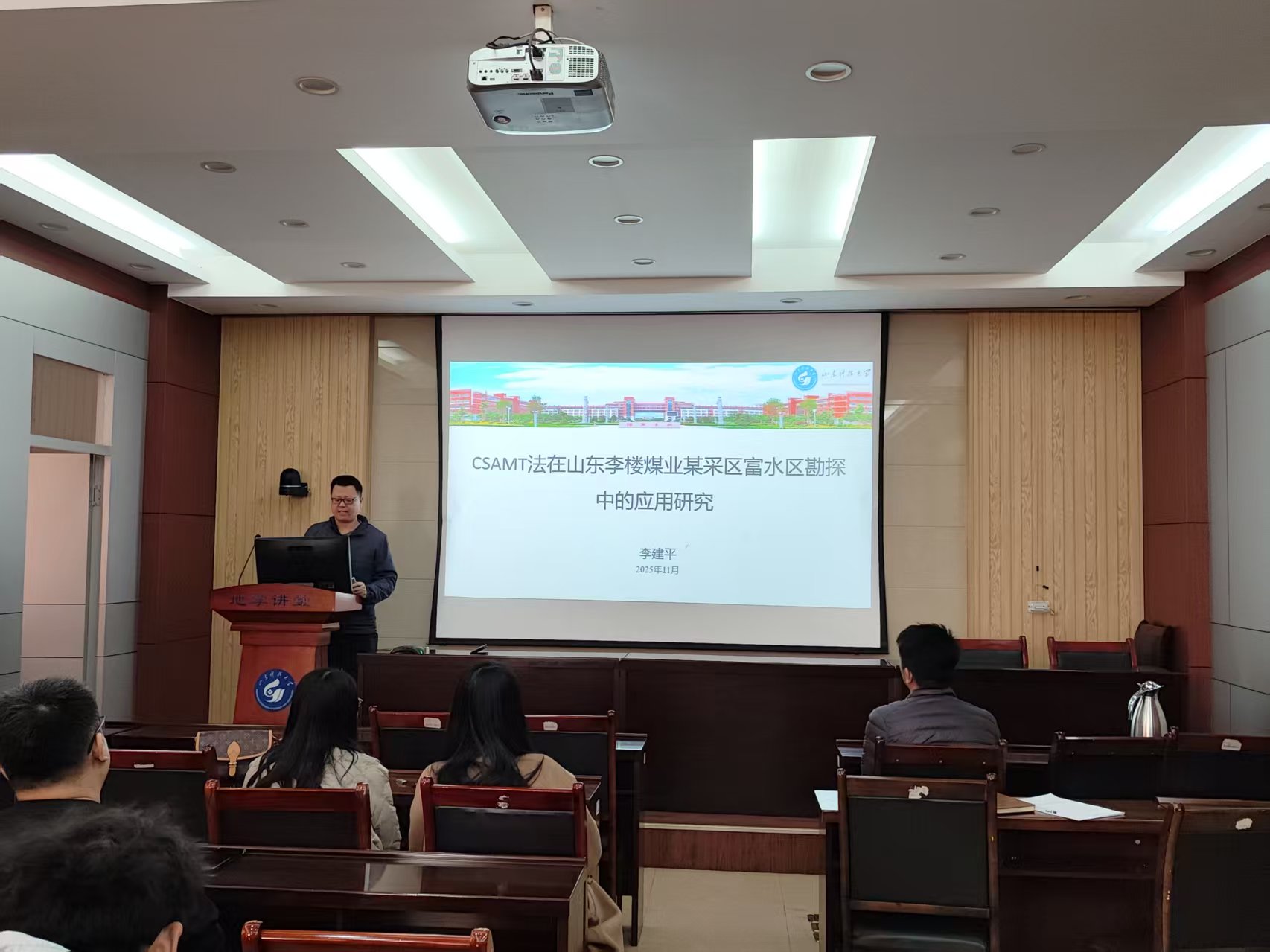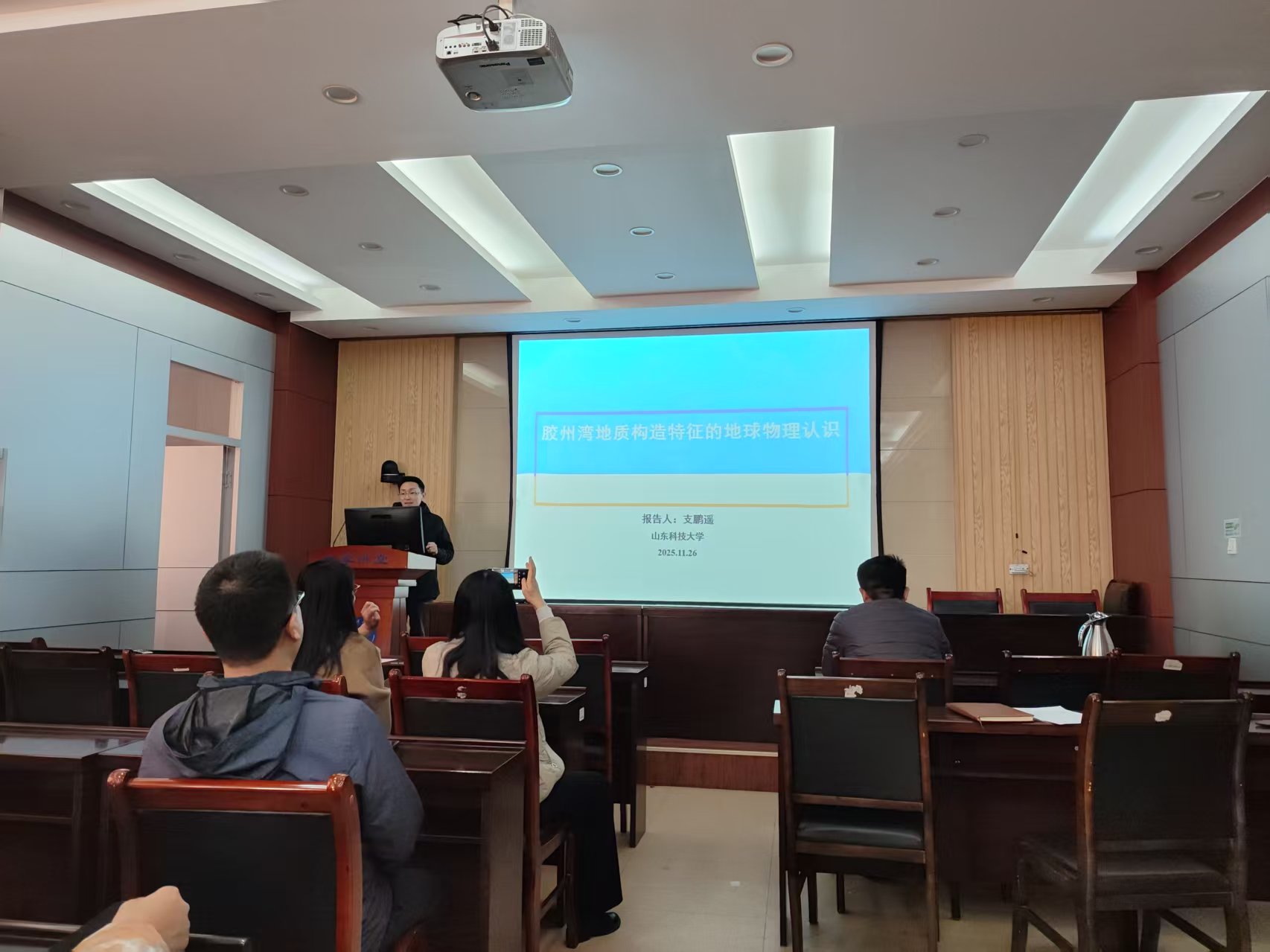 本期活动采用了学术报告会的形式。支部杨思通、支鹏遥、宋翠玉、崔岩、李建平、王德营、张金伟和丁仁伟等八位老师,结合自己的研究方向,依次登台,分别以“采煤工作面内隐伏构造槽波地震数据智能成像方法研究”、“胶州湾地质构造特征的地球物理认识”、“天文节拍与湖面舞动:黄岗盆地的盐沉积印记”、“机器学习在录井岩性识别中的应用”、“CSAMT法在山东李楼煤业某采区富水区勘探中的应用研究”、“基于生成对抗网络的弱信号增强方法”、“沁水盆地煤层气地震储层反演与有利目标预测”和“AI赋能透视地下-地震断层智能解析系统”为题,围绕科学问题提出、研究思路构建、技术方法创新及核心结论提炼等方面展开全方位、深层次分享,展现了地球物理领域的前沿探索与实践成果。