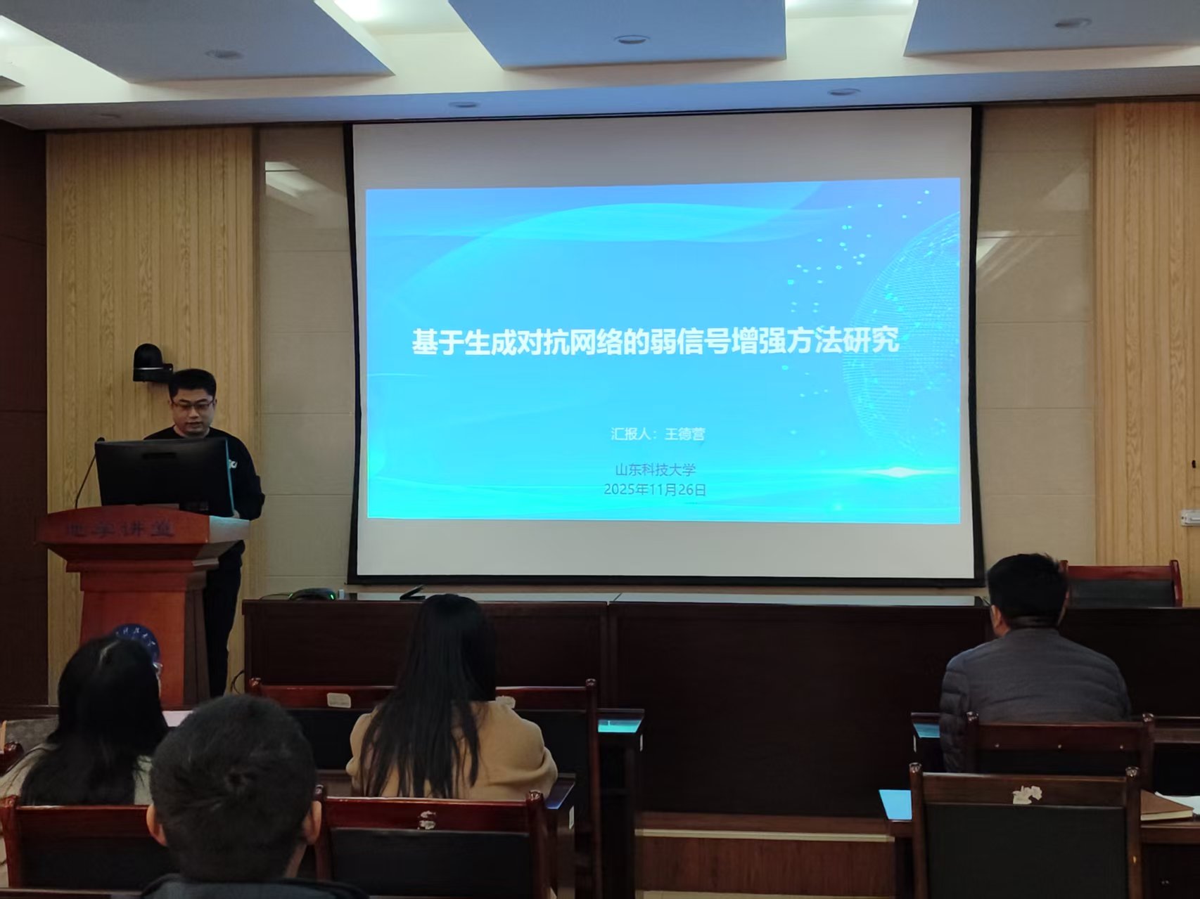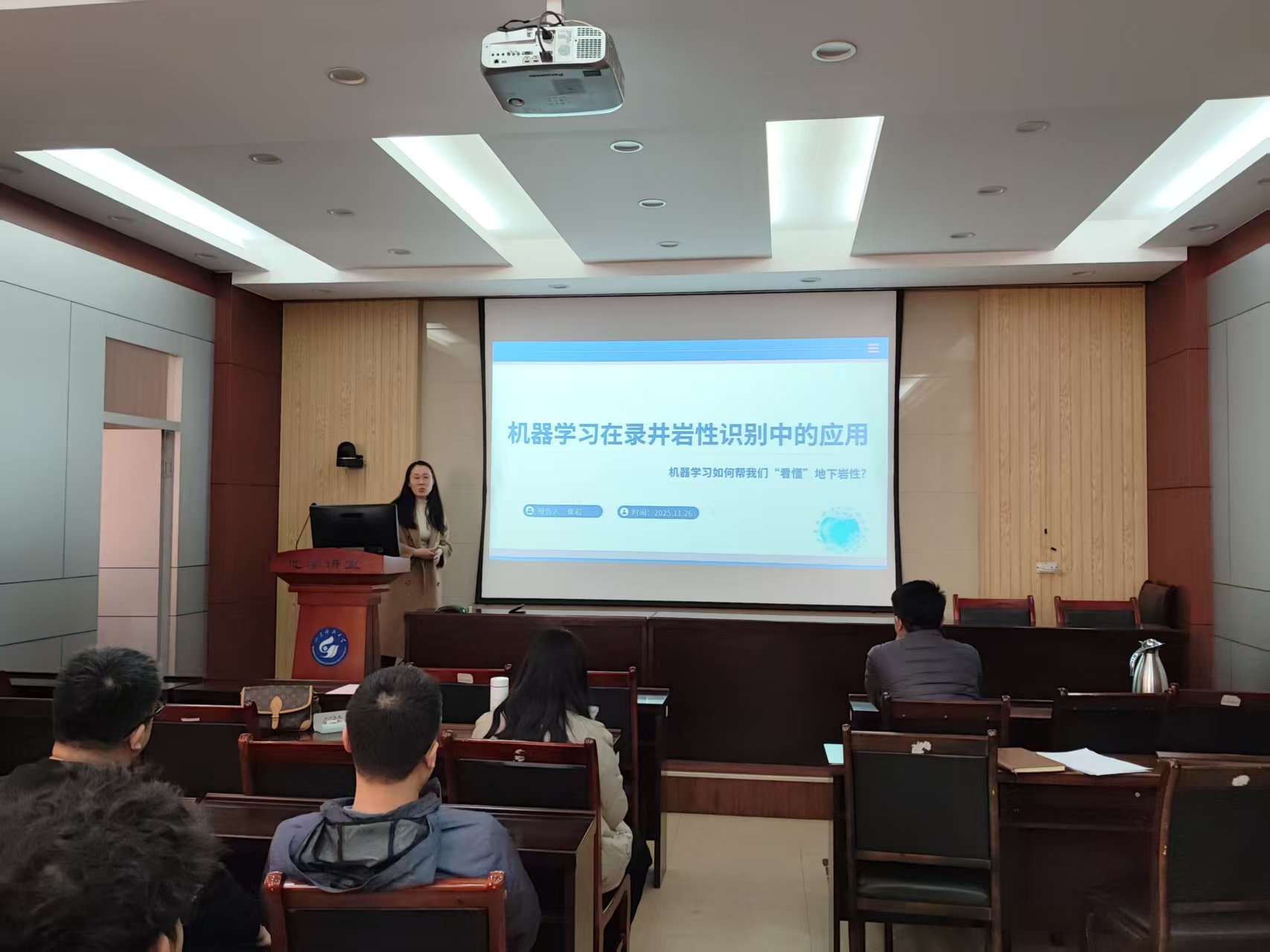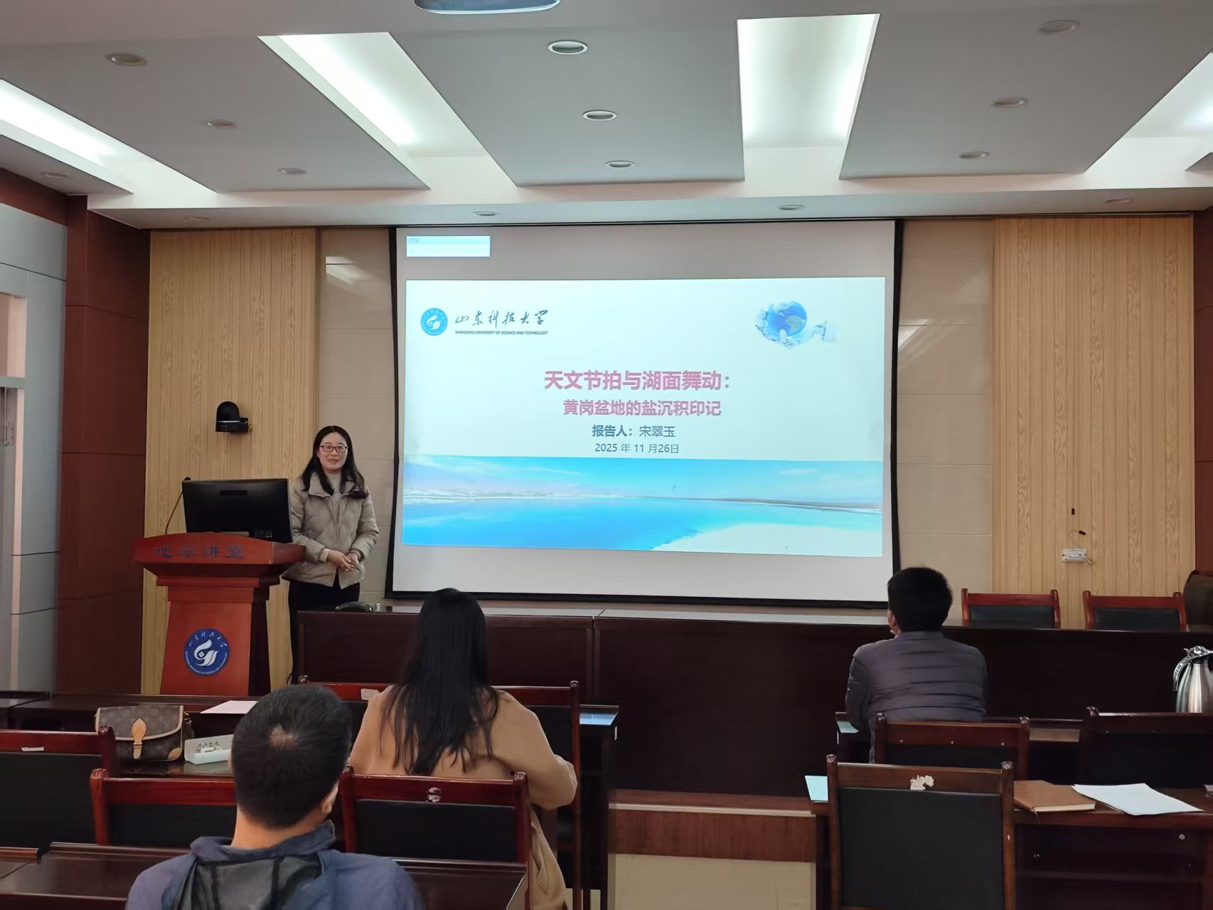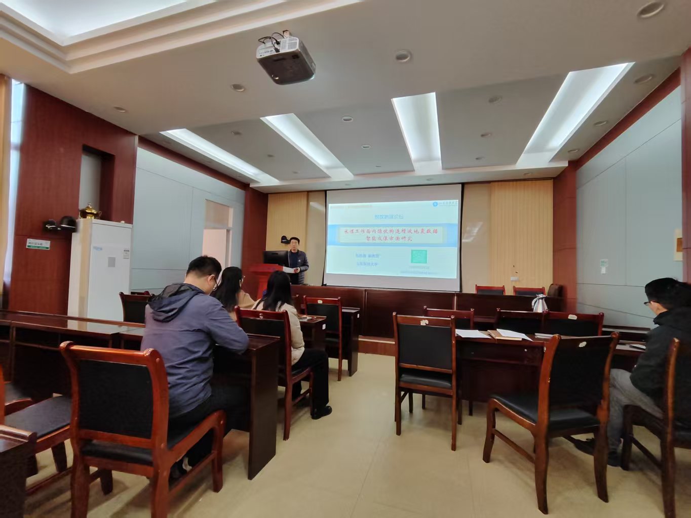本期活动采用了学术报告会的形式。支部杨思通、支鹏遥、宋翠玉、崔岩、李建平、王德营、张金伟和丁仁伟等八位老师,结合自己的研究方向,依次登台,分别以“采煤工作面内隐伏构造槽波地震数据智能成像方法研究”、“胶州湾地质构造特征的地球物理认识”、“天文节拍与湖面舞动:黄岗盆地的盐沉积印记”、“机器学习在录井岩性识别中的应用”、“CSAMT法在山东李楼煤业某采区富水区勘探中的应用研究”、“基于生成对抗网络的弱信号增强方法”、“沁水盆地煤层气地震储层反演与有利目标预测”和“AI赋能透视地下-地震断层智能解析系统”为题,围绕科学问题提出、研究思路构建、技术方法创新及核心结论提炼等方面展开全方位、深层次分享,展现了地球物理领域的前沿探索与实践成果。