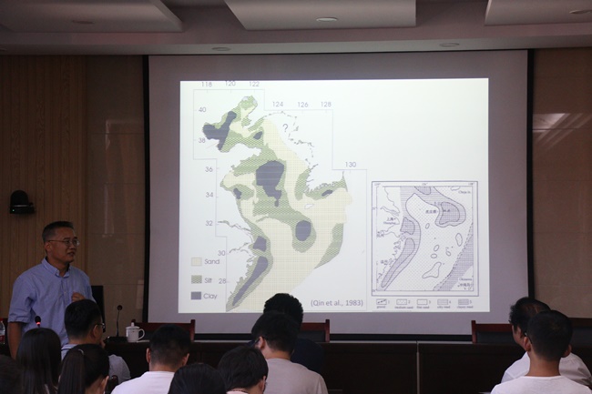 会上,刘教授以《亚洲河口海岸三角洲研究近况及最新进展》为题,系统介绍了他在亚洲主要河口三角洲地区开展的调查研究,总结了亚洲主要河口地区的沉积物分布特征、地层结构和输运规律,详细阐述了河流入海物质对河口陆架的沉积影响。特别是近几十年来,受蓄水建坝、调水调沙等人类活动的影响,河口三角洲出现了不同程度的侵蚀现象;利用遥感、数值模拟和现场观测等技术手段,探讨了自然因素和人类活动对河口海岸变迁的影响。刘教授讲解深入浅出,语言幽默生动,极大地调动了与会老师及同学们的学习积极性。大家踊跃发言,对不同河口三角洲的沉积特征差异、主要控制因素等科学问题进行了深入交流和探讨。最后,刘教授结合当前海洋地学研究热点,对我院海洋地学科研发展方向提出了建设性的意见。