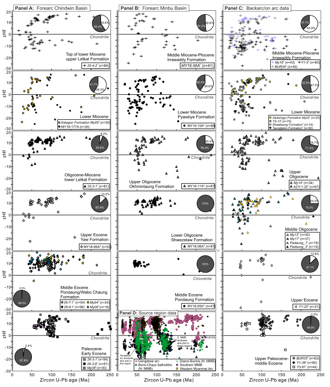 我院栾锡武教授同英国、德国、巴拿马、意大利、巴西、缅甸等等多国科学家合作在缅甸印缅山脉、缅中盆地进行了多条剖面100多个站位的地质采样分析,对样品开展了岩相学分析、碎屑锆石U-Pb和Hf分析、金红石U-Pb分析和Sr-Nd全岩分析等多技术物源研究,确定了亚洲沉积物质首次进入缅甸中央盆地是发生在晚始新世和早渐新世之后,进而限定了西缅甸(WBT)-亚洲地体的碰撞时间;以及对印缅山脉(IBR)进行了低温热年代学分析,厘定了渐新世-中新世之交的折返时期,对IBR的低温热年代学研究记录了早中始新世和渐新世-中新世之间两个时期的折返,推断始新世折返事件可能与 WBT 与印度地块的碰撞有关,而后来的渐新世-中新世之间的折返事件可能与沉积物供应增加所导致的楔形动力变化有关。