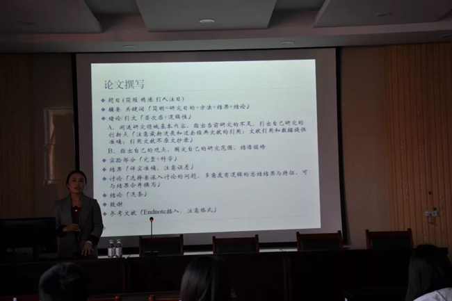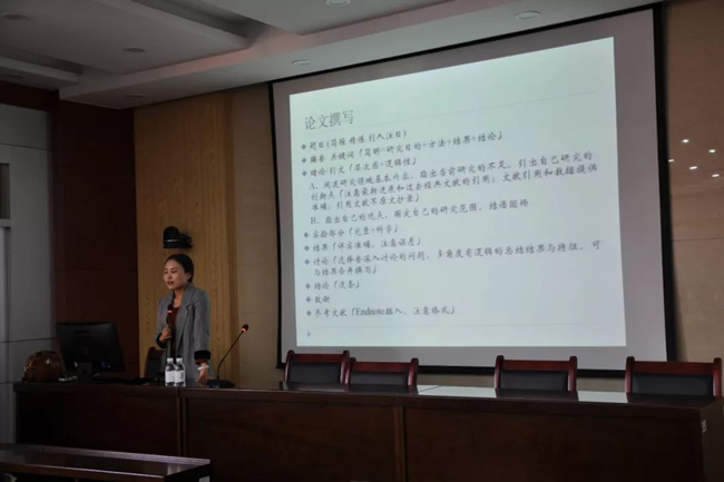 会议中,崔蓝月对学术论文的结构、撰写规则、写作技巧、投稿问题、专家意见的回复等内容进行了详细地讲解。崔蓝月博士在会议上介绍了自己学术论文写作的“5C”(Correctness、Clarity、Concision、Completion and Consistency)原则,并对各个要求进行了解释。紧接着,崔蓝月博士分别对写作中的大框架和各种细节进行了介绍。