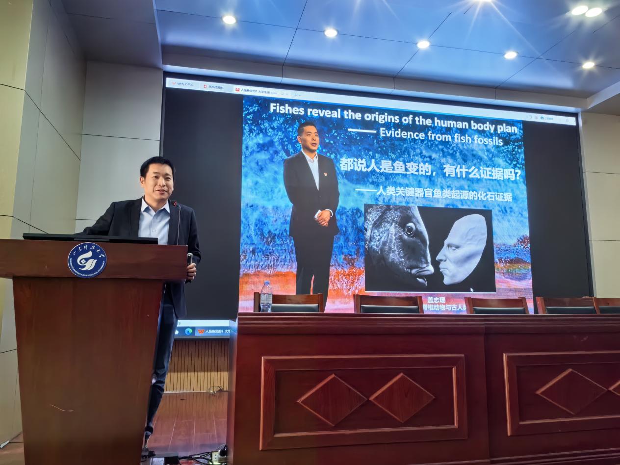 11月21日,yl88858永利官网在J6-433承办第97期名家讲坛,中国科学院古脊椎动物与古人类研究所研究员盖志琨做了题为“人类关键器官鱼类起源的化石证据”的报告,副院长尹会永主持。