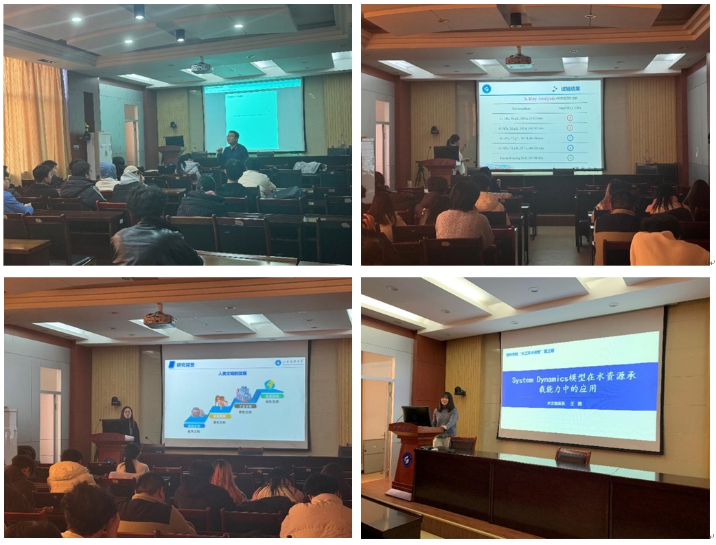 报告会上,孙涛老师以“岩土工程创新思维及实践”为主题向学生介绍了变截面桩、柔性面层、桩锚支护技术成果及工程应用,结合自身丰富的实践经验向学生强调了拥有学习能力的重要性;苗佳丽老师围绕“海水环境下水泥土劣化机理研究”课题,介绍了水泥土加固机理及微型贯入仪、X-ray衍射、扫描电镜等测试方法在水泥土劣化机理研究中的应用;张彧齐老师在“环境介质中重金属污染源解析及健康风险研究”报告中详细讲述了重金属污染主成分分析法、PMF模型等源解析技术及其应用案例,同时展望了重金属污染源解析技术未来的发展趋势;王鸽老师在“System Dynamics模型在水资源承载能力中的应用”汇报中聚焦水资源的可持续利用及生态环境协调发展,结合案例介绍多目标分析法、多目标决策TOPSIS法、系统动力学法(System Dynamic,SD)等在水资源承载能力评价及预测中的应用。