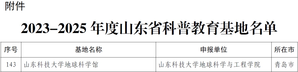 近日,山东省科学技术协会公布了“2023-2025年度山东省科普教育基地”认定结果,“山东科技大学地球科学馆”成功入选。
