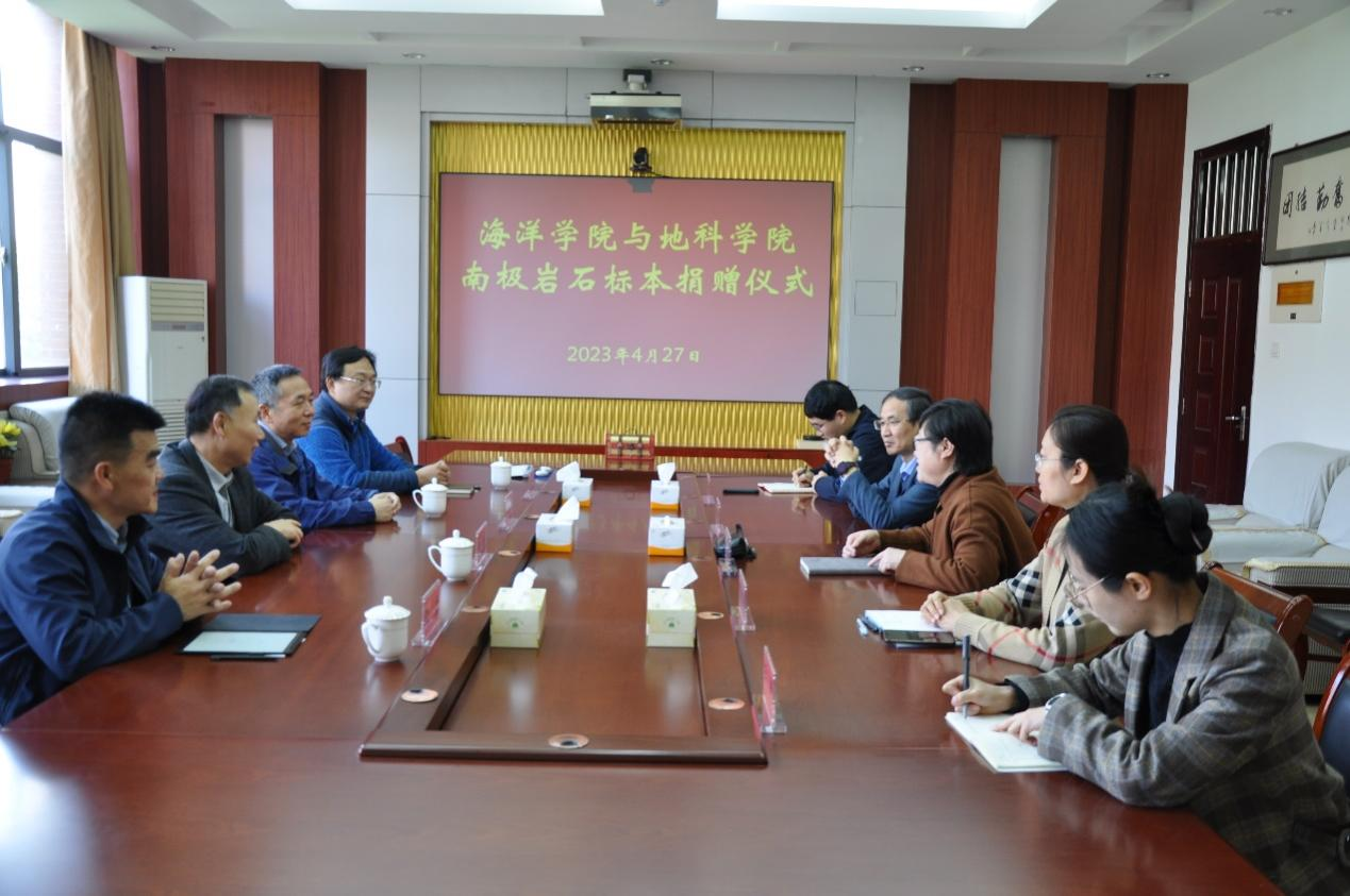 4月27日,我校海洋学院向yl88858永利官网捐赠南极岩石标本仪式在yl88858永利官网427会议室举行。海洋学院党委书记朱建国、院长周兴华、副书记陈永磊、教师王磊,yl88858永利官网党委书记高慧、院长常象春、副书记李晓静、副院长孟元库、地球科学馆馆长王倩参加捐赠仪式。仪式由高慧书记主持。