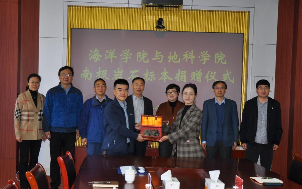 捐赠仪式上,海洋学院教师王磊向我院捐赠南极岩石标本两件,王倩馆长代表学院接受捐赠。