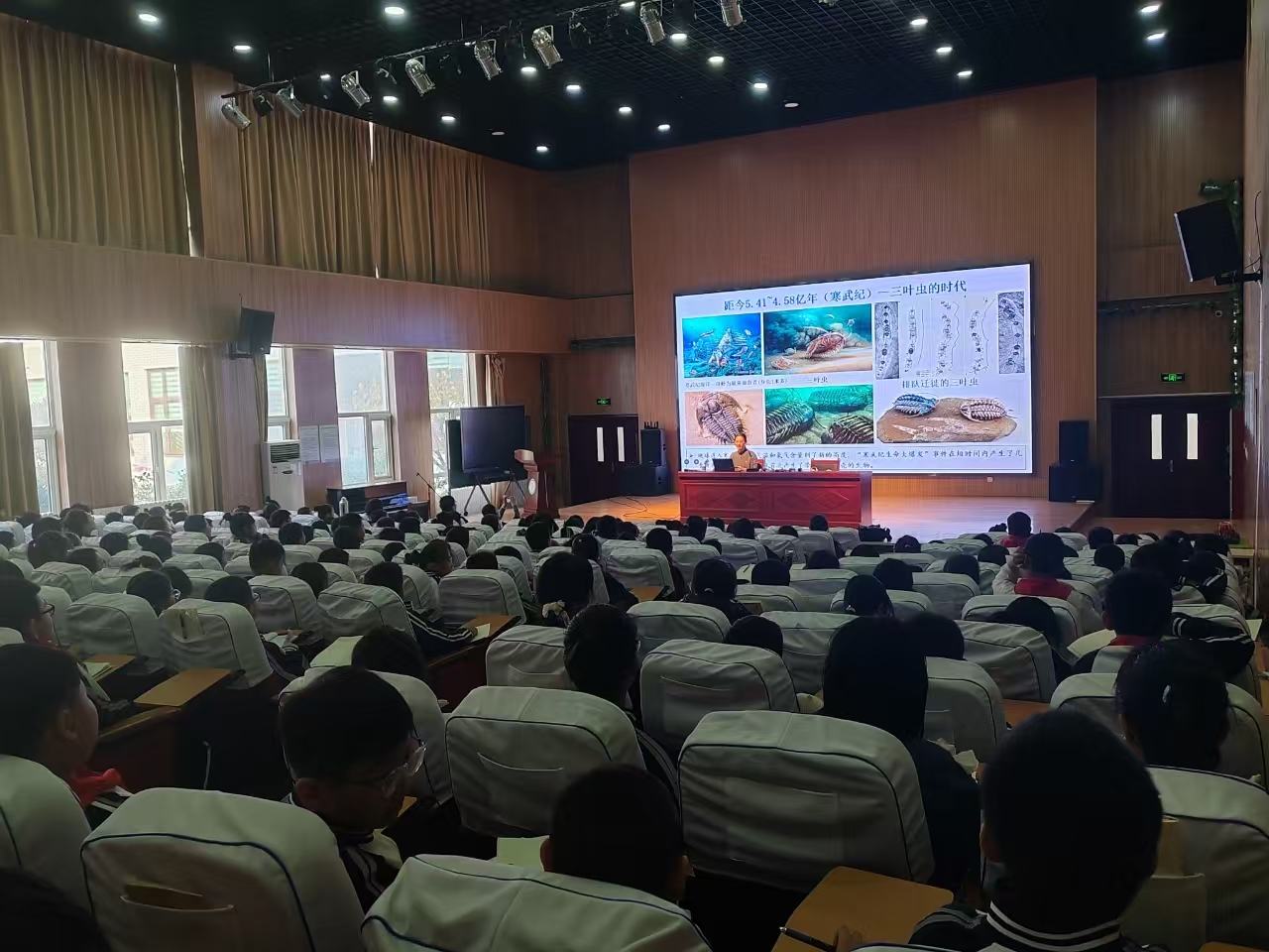 王倩以《地球“时光机”》为题,首先为育英小学师生带来了一场地球科学知识科普讲座。王倩以小学生熟悉的微信开启页面开篇,沿地质时间轴线,用岩石、化石等标本讲述了地球46亿年的地质和生命演化,和同学们一起乘坐“时光机”,踏上了一场别具一格的时空穿越之旅。课堂上,同学们紧跟王老师的思路,积极提问,与老师热烈探讨,氛围活跃而有趣。