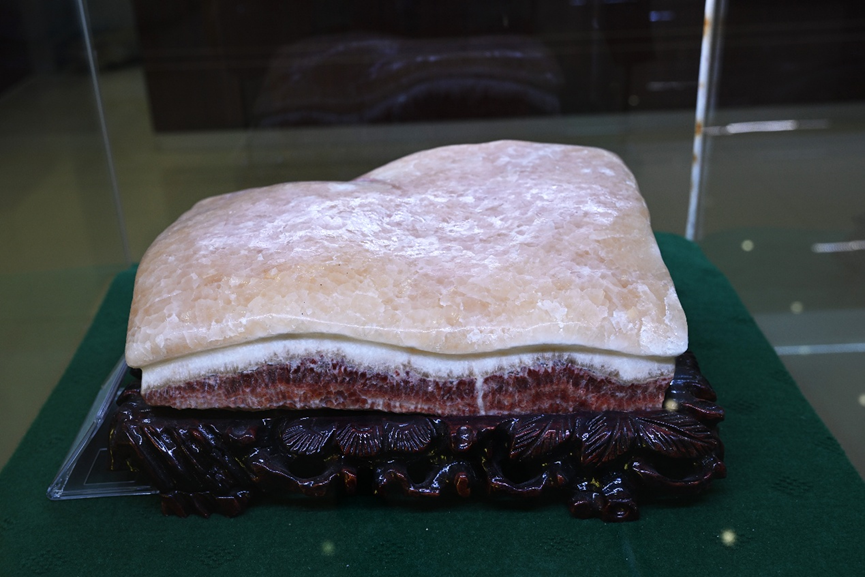 肉石,又称彩霞石,可给人以猪肉中五花肉之感。系呈巨大脉带状产生的张性断裂破碎带,在构造摩擦热力和地下水的长期作用下,形成不同深浅的红、橙、白的方解石环带状沉淀、胶结而成。
